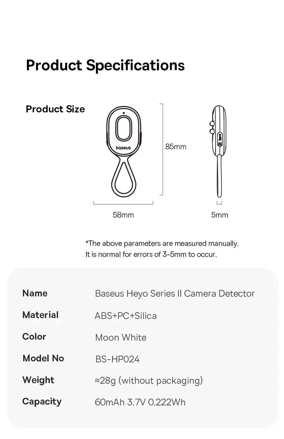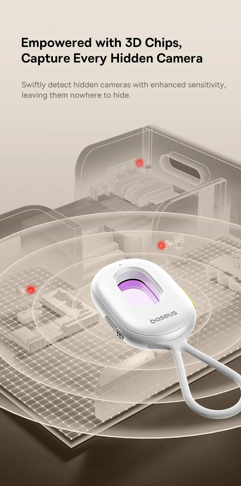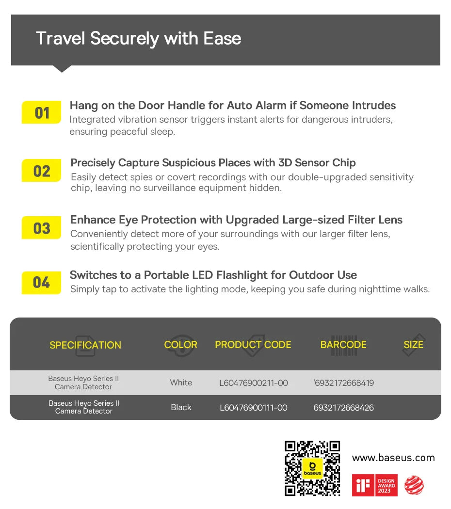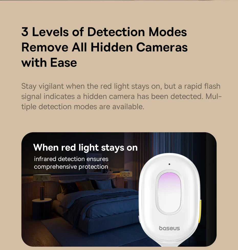 Protect your privacy anywhere you go with the Baseus Camera Detector. This portable, rechargeable device detects hidden cameras and suspicious signals, giving you peace of mind whether at home, in hotels, or offices.